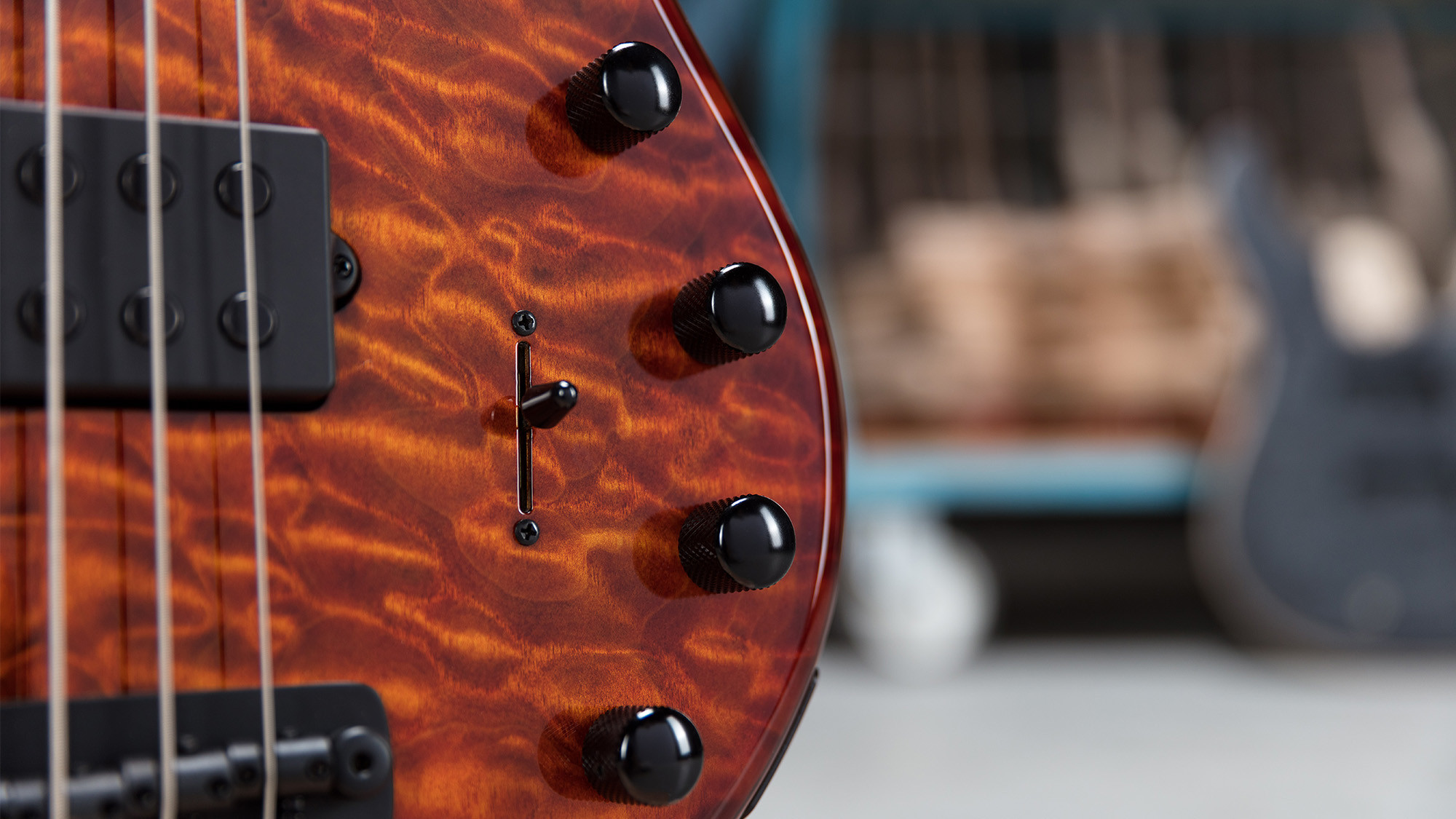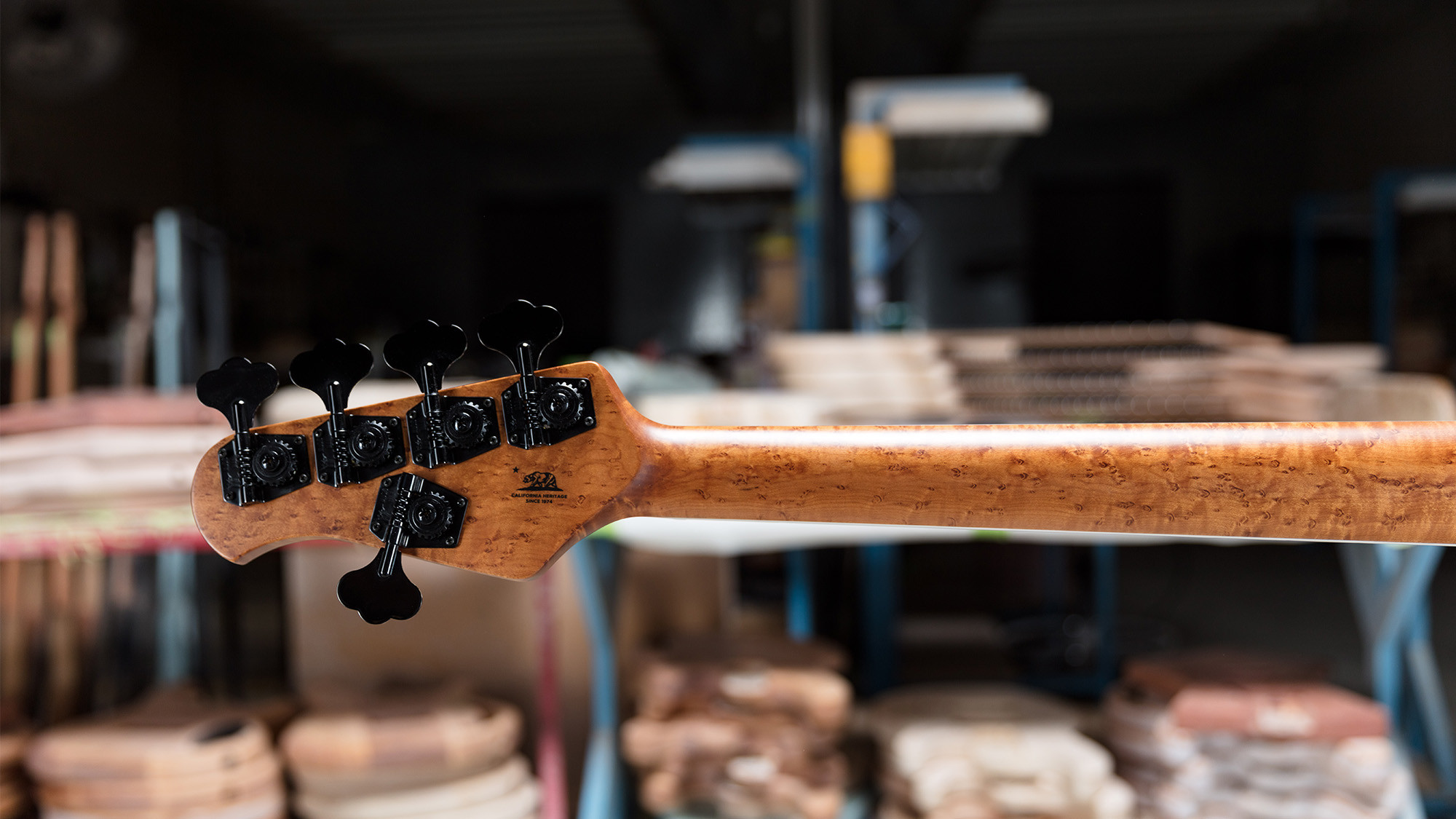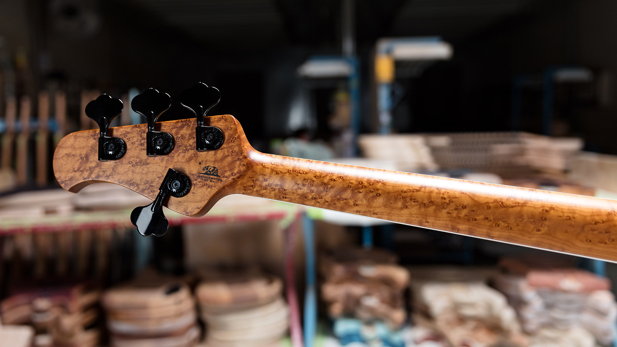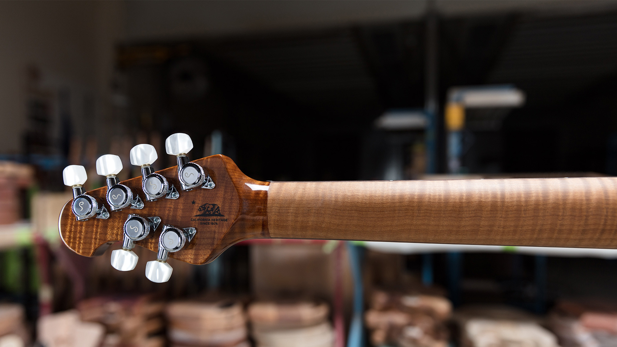 Precioso mástil roasted de arce figurado con clavijeros negros, estilo Music Man, pero firmados por el especialista Schaller.