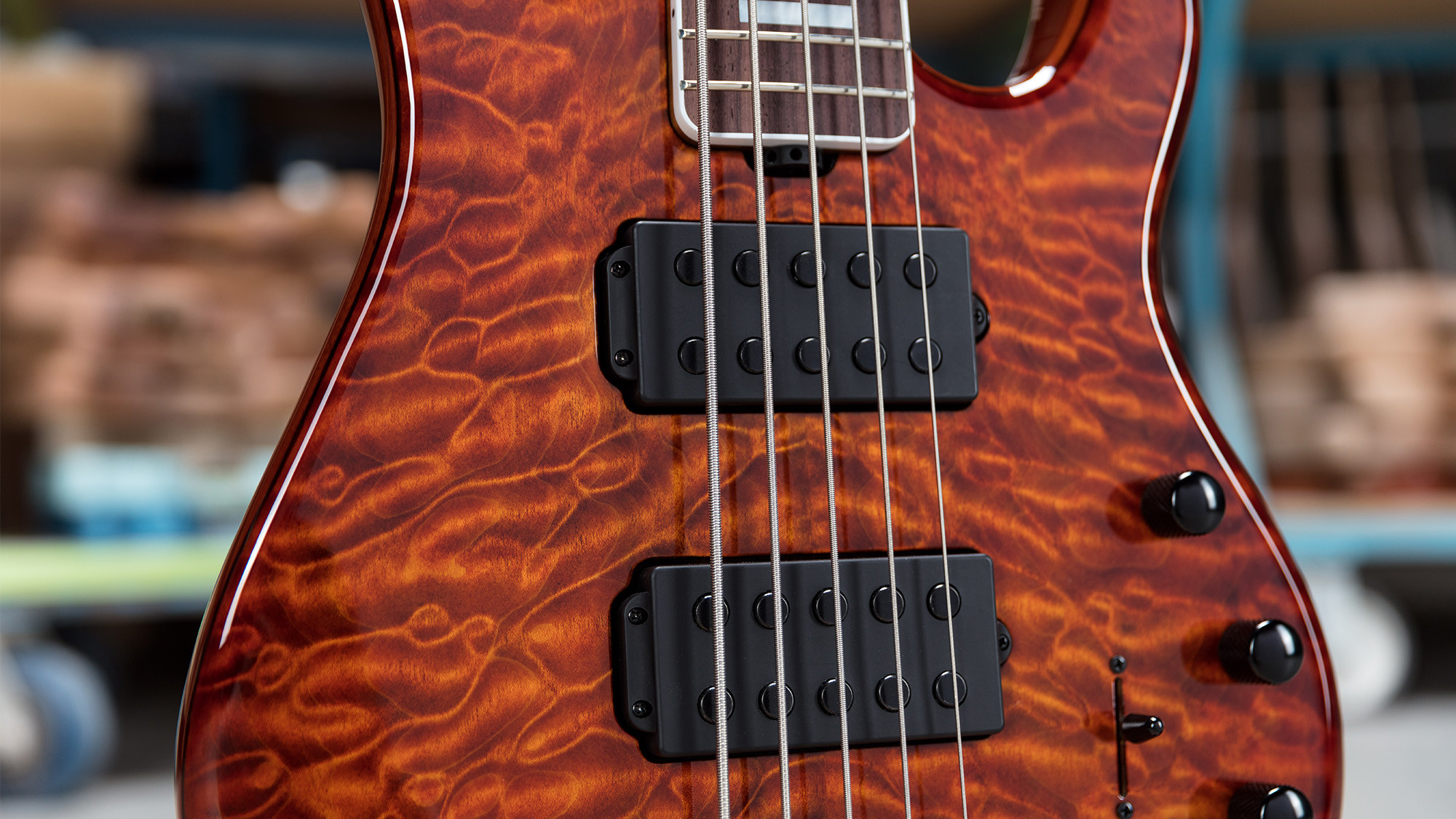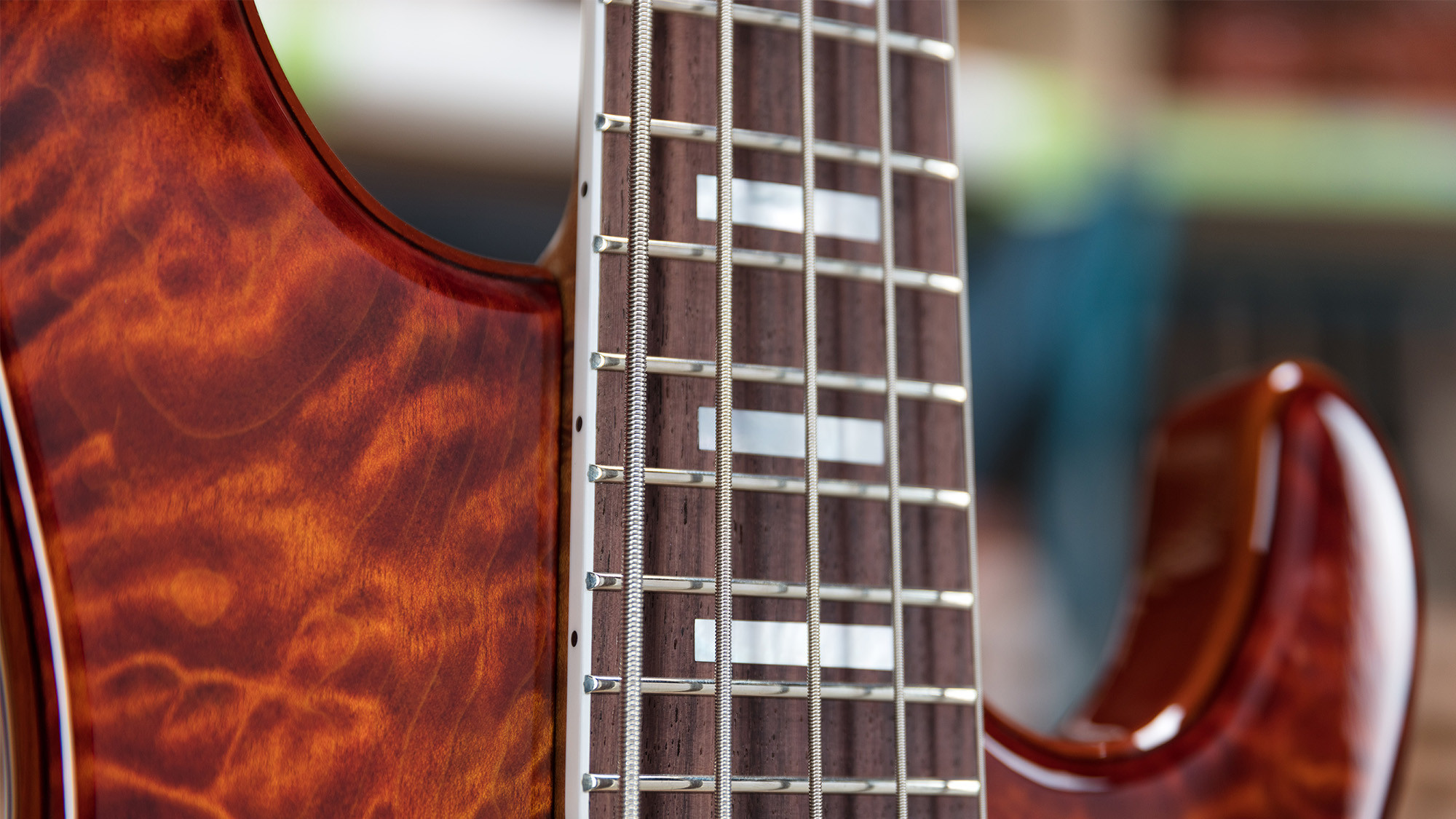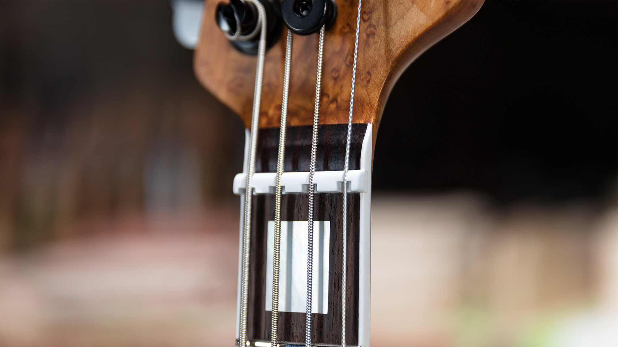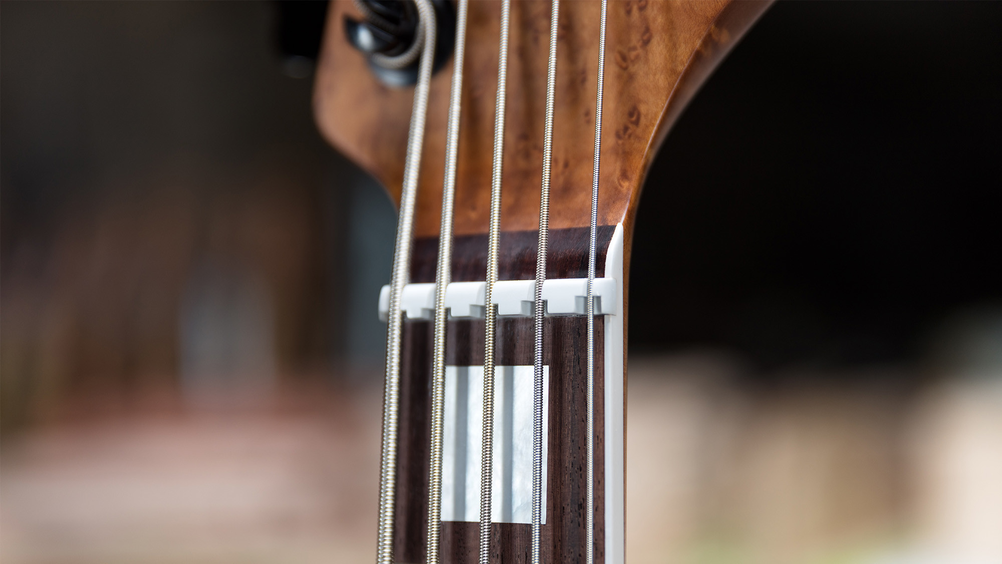 Mástil en acabado satinado, de arce figurado y con clavijeros Schaller con piezas de madreperla