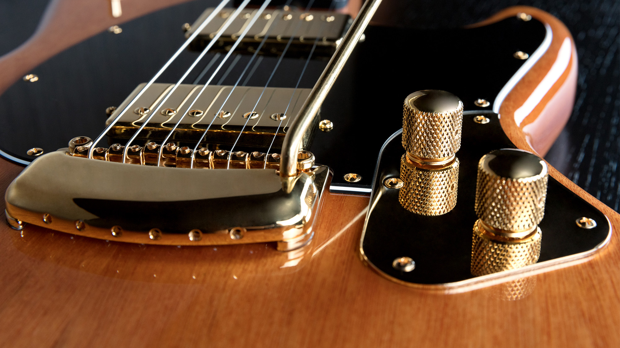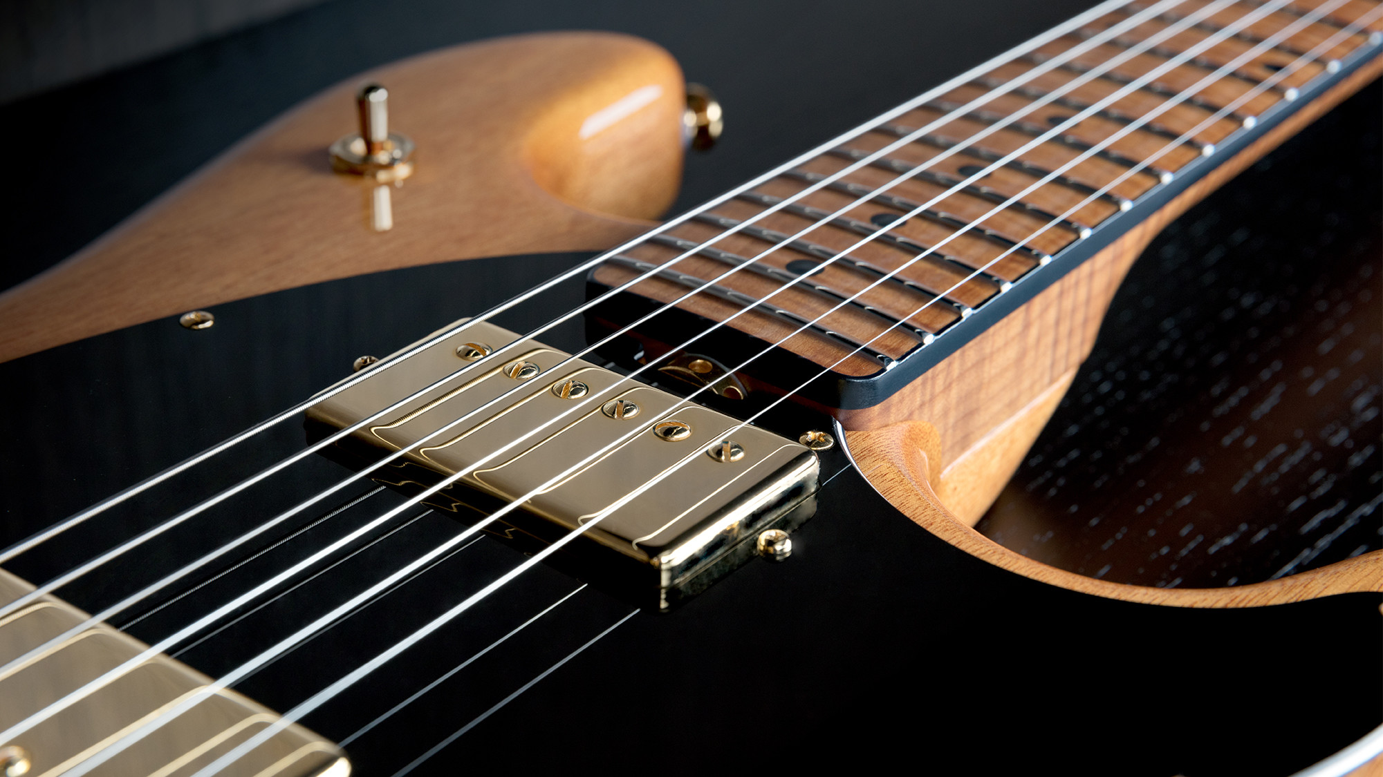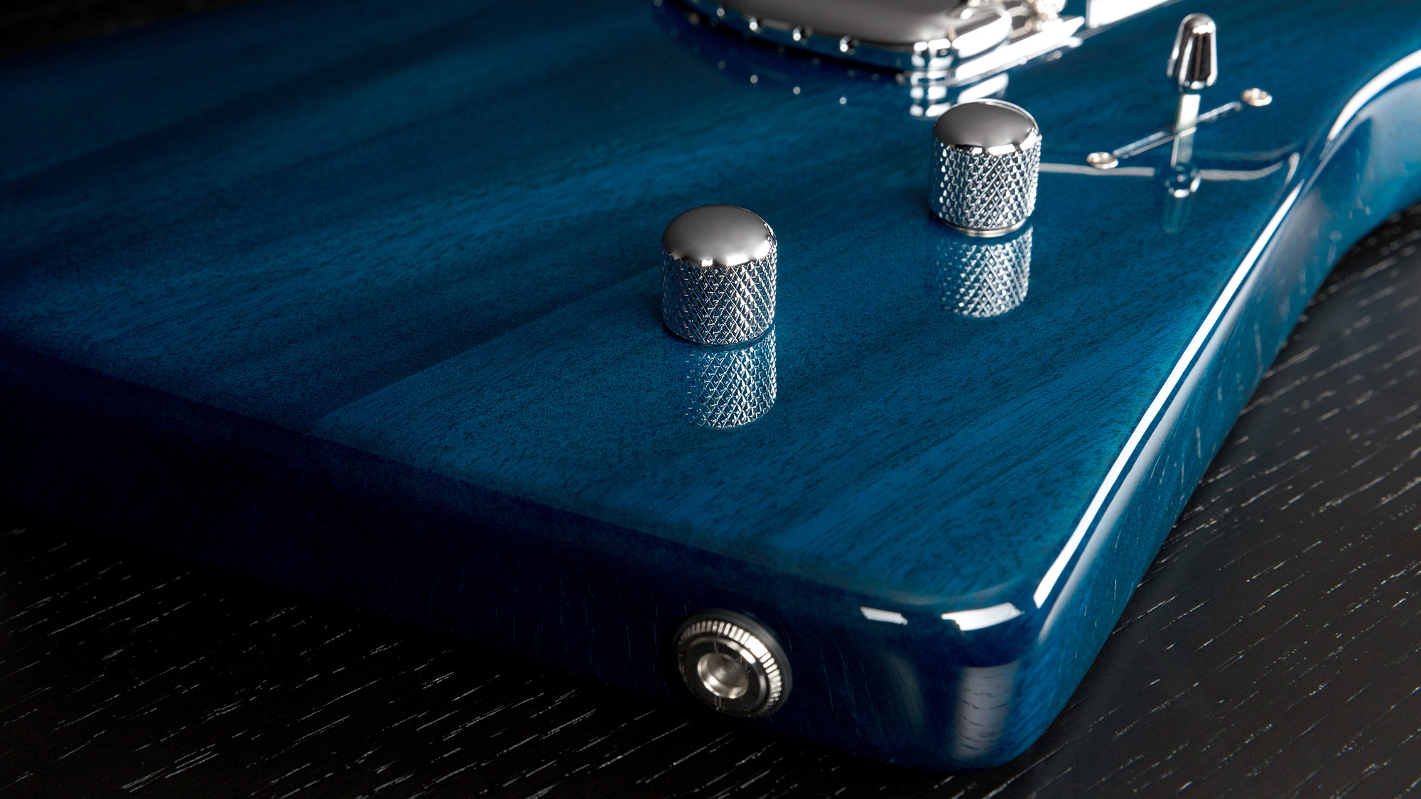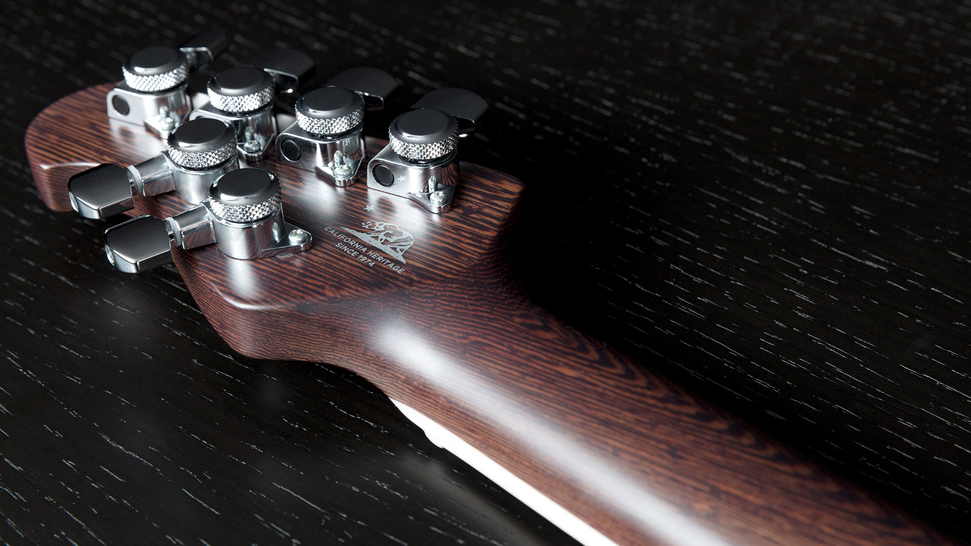 Tanto los clavijeros de bloqueo, el puente, los potenciómetros, las tapas de las pastillas o la cejuela, se han terminado en color negro para conseguir una estética tan especial