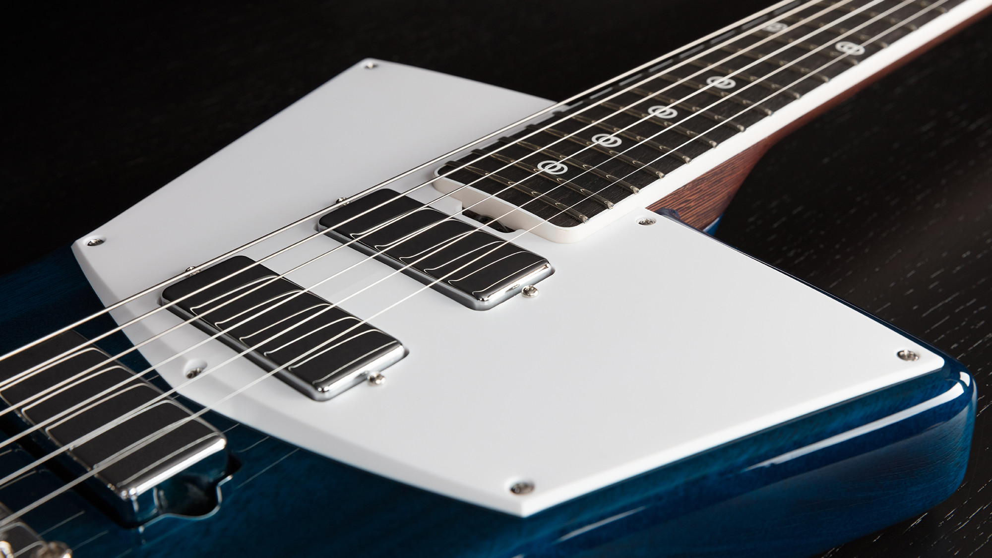 El mástil neck-through oscuro contrasta con la terminación en blanco del binding